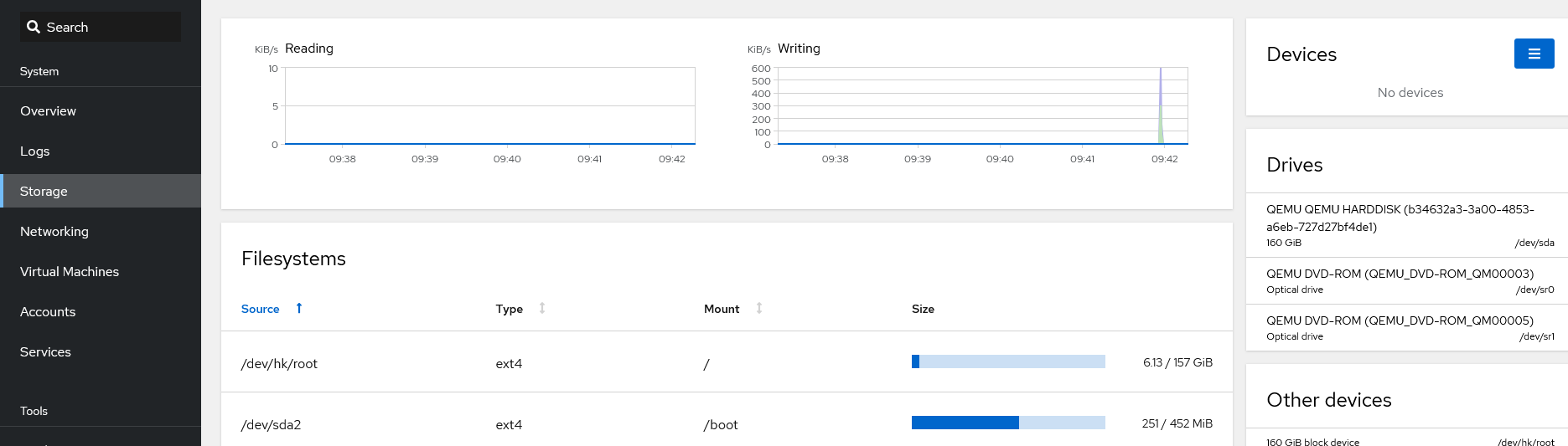 - Drives: List of physical disks. You can create partition tables, format disks.