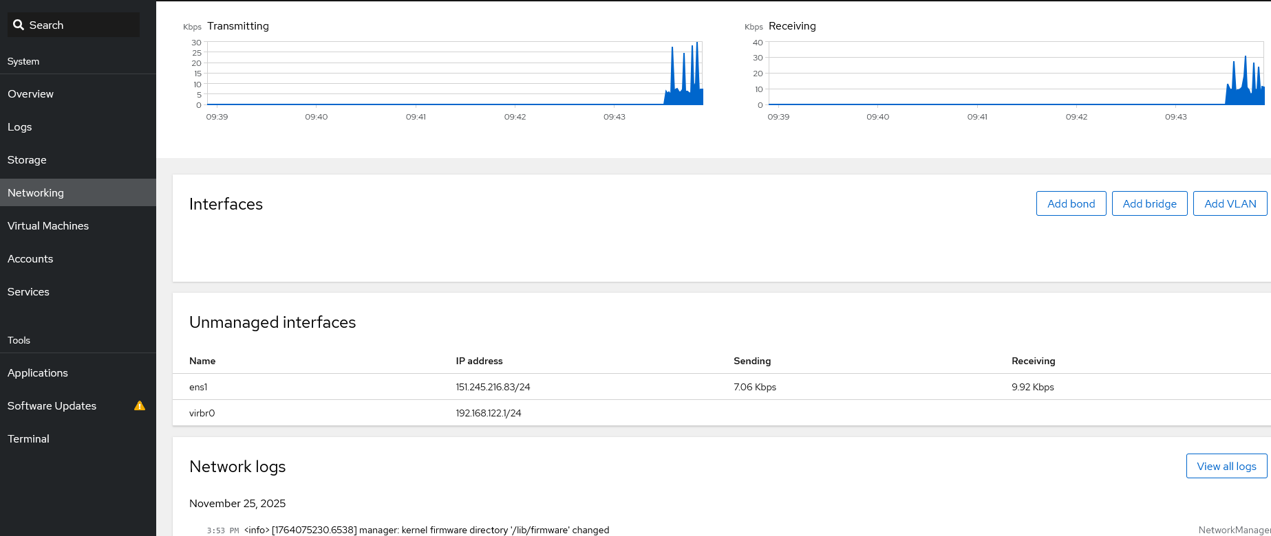 - Add Bridge / Add Bond / Add VLAN: Buttons to create network bridges (Bridge), channel aggregation (Bonding), and VLAN. This is a critically important section for configuring virtual machine networking (creating