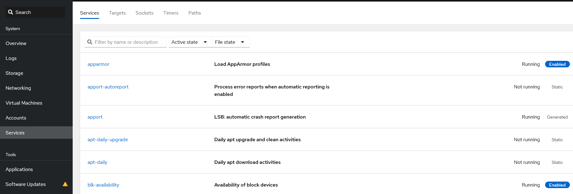 - Services: List of all daemons (services). You can start, stop, restart, and enable/disable service autostart (e.g.,