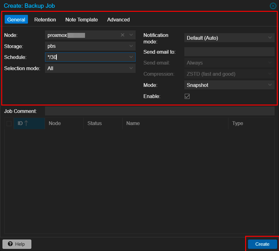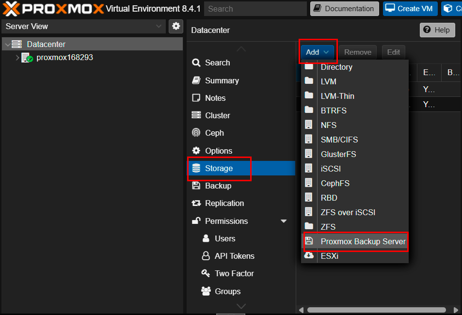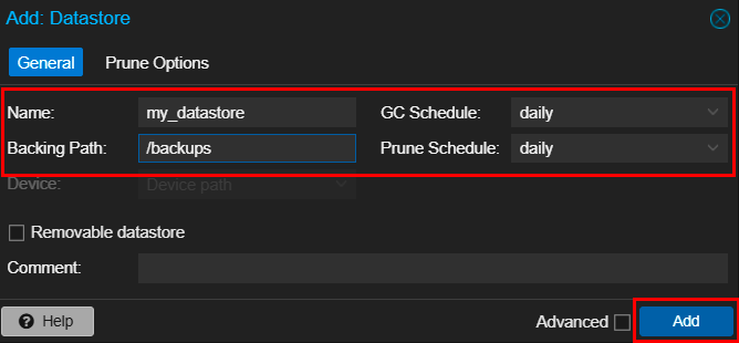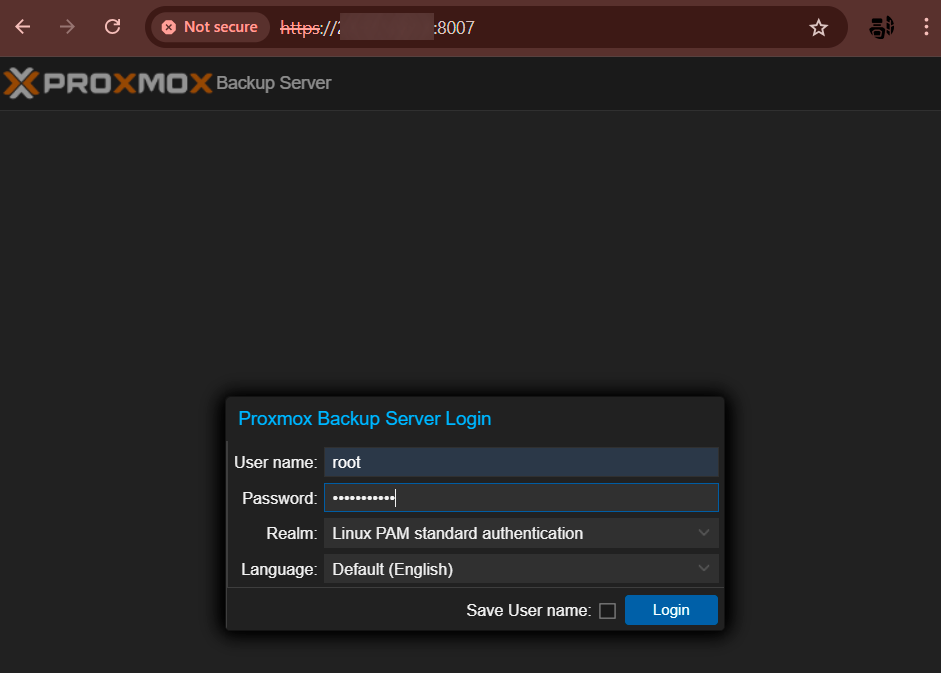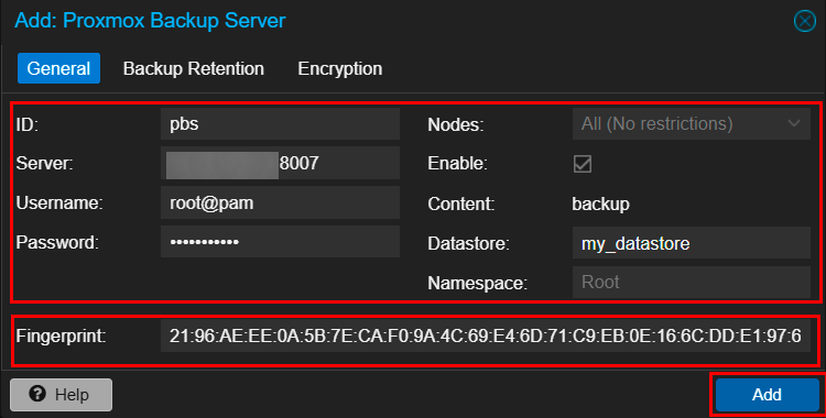 <IP>:8007); - Datastore: Name of the datastore created on Proxmox Backup Server;
