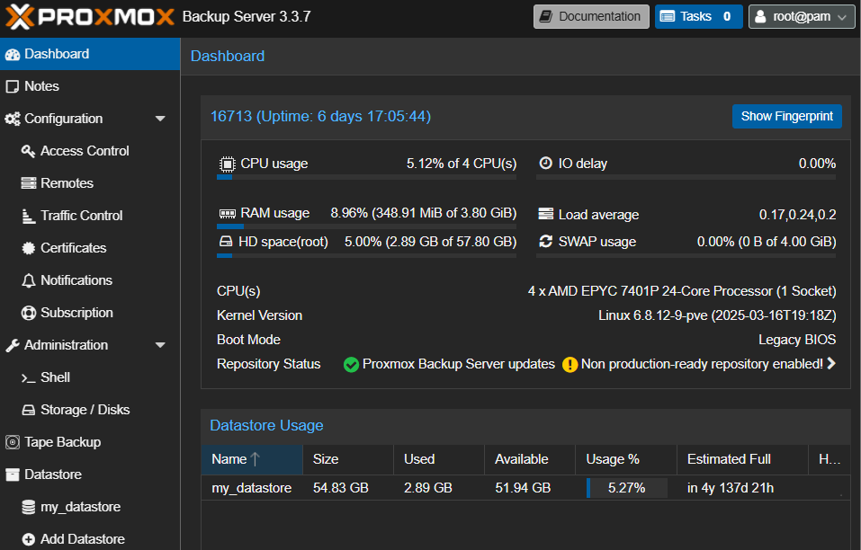 yto confirm. Remember or note this fingerprint - it is needed when adding the datastore in Proxmox VE. -