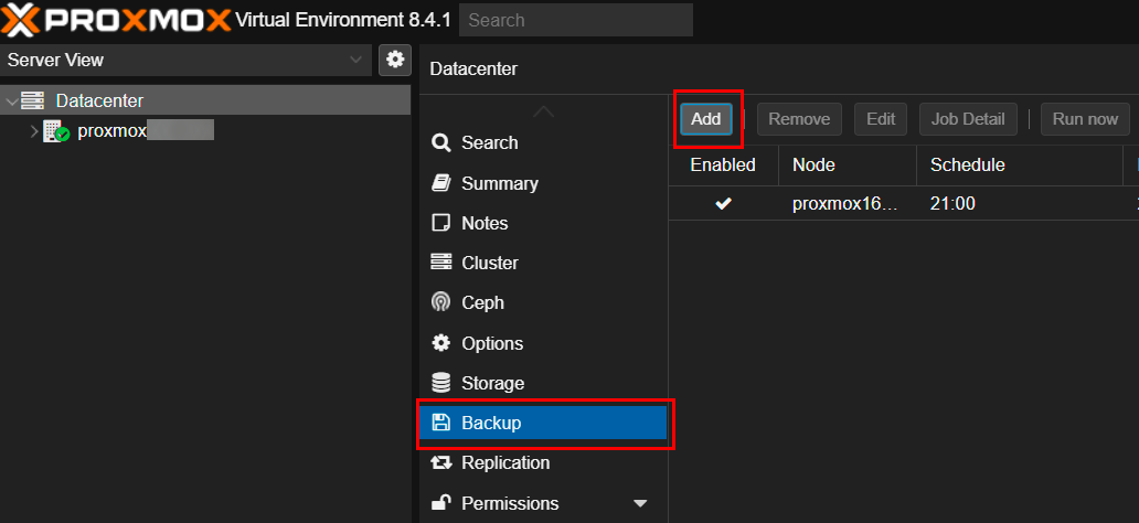 proxmox_<ID_server>→pbs (proxmox_<ID_server>); - Go to the Backups tab;