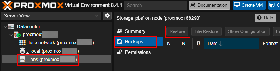 - In the Proxmox VE web interface, go to the PBS datastore by clicking on it in the sidebar: