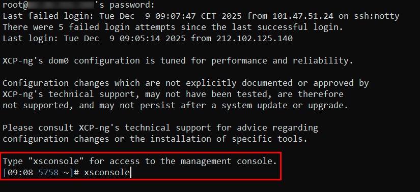 - Enter the password when prompted. After successful connection, you will be in the XCP-ng command line.