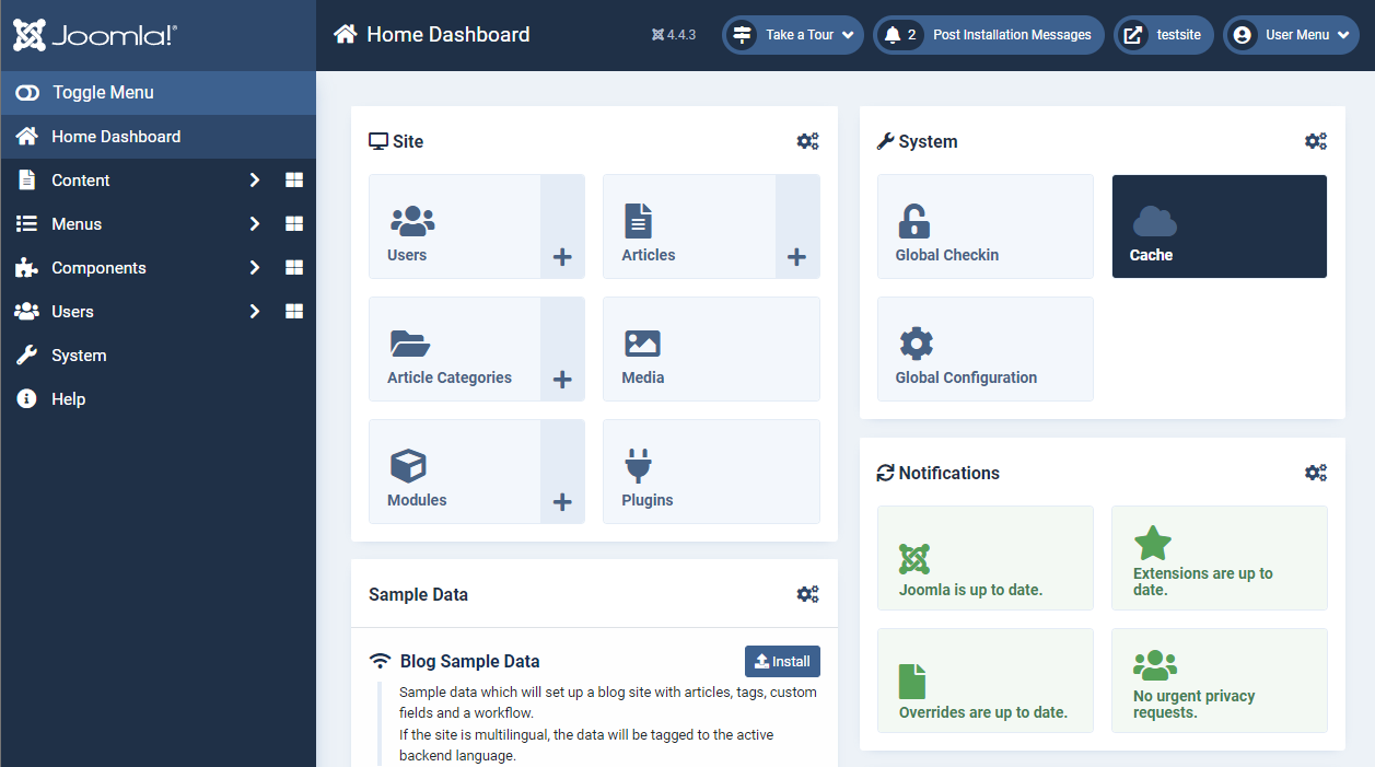 - Home dashboard - The main page of the Joomla Admin Panel. It displays general information about the system, statistics of visits, recent user actions, notifications of updates. Home dashboard allows you to quickly assess the current state of the site.