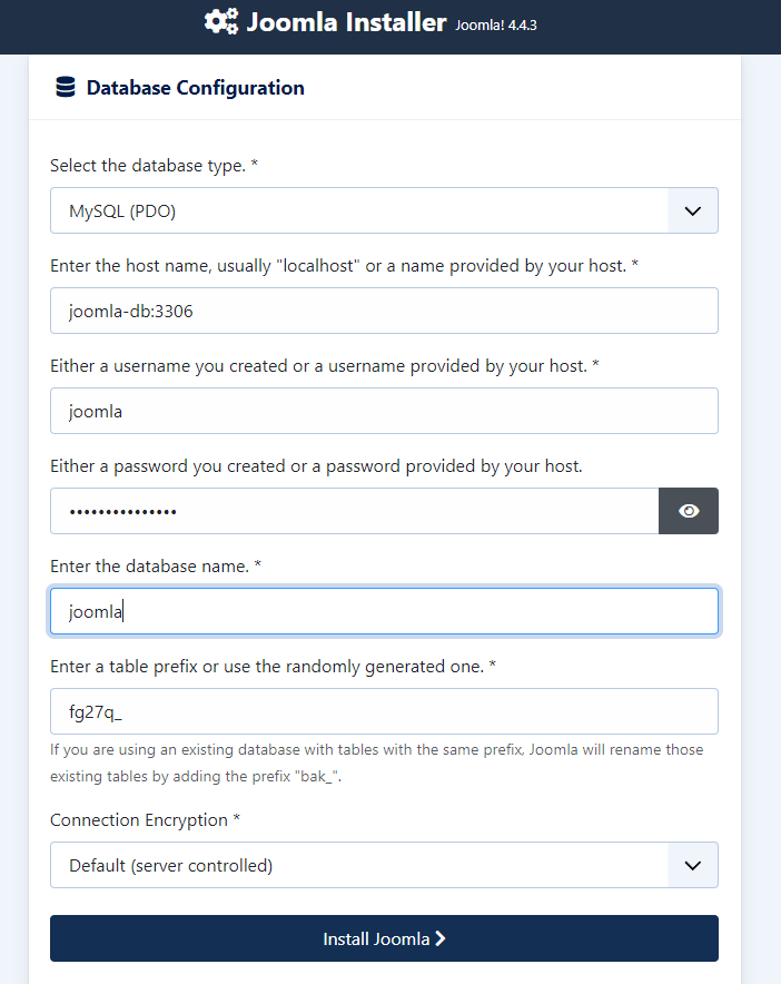 To connect to the MySQL database, select MySQL (PDO) as the database type, specify the host name (joomla-db:3306), database user name (by default - joomla) and MySQL user password (by default - joomla-password), and specify the database name (by default - Joomla) and the prefix of the database tables. The latter can be generated randomly.