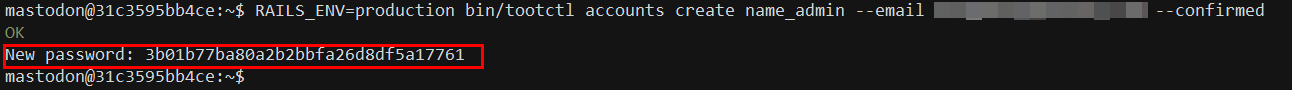 tootctl accounts create. Specify the username, email, and the--confirmedflag for account confirmation.ReplaceRAILS_ENV=production bin/tootctl accounts create new_username --email [email protected] --confirmednew_usernamewith your desired username and[email protected]with the actual email of the user. After executing this command, the user will be created. Be sure to save the password displayed on screen: