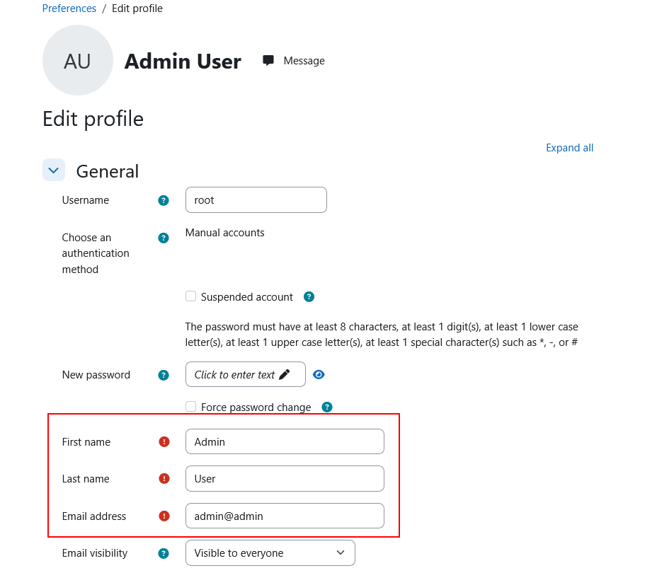 After making any changes, click the Update Profile button at the bottom of the page. For more information on the basic settings of Moodle, see the documentation of the developers.