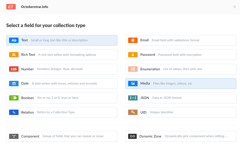 - Dynamic Zone — for dynamically editable components.