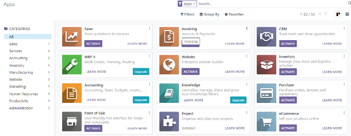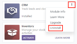 Each application has an ACTIVATE button - for free Odoo apps or an UPGRADE button- for paid apps. To install an app, simply click the ACTIVATE button. You can uninstall the app using the menu (3 Vertical Dots) in the app’s panel and selecting Uninstall: