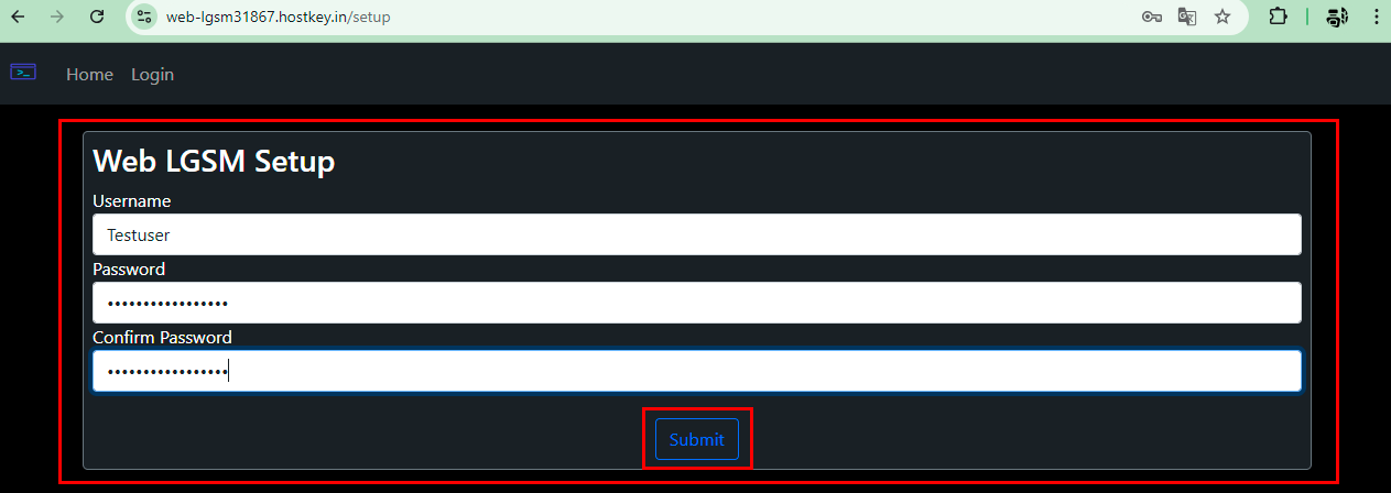 After installation, you need to go to the link: https://web-lgsm<Server_ID_from_Invapi>.hostkey.in/setup - during initial setup, then you can use the link https://web-lgsm<Server_ID_from_Invapi>.hostkey.in/login.