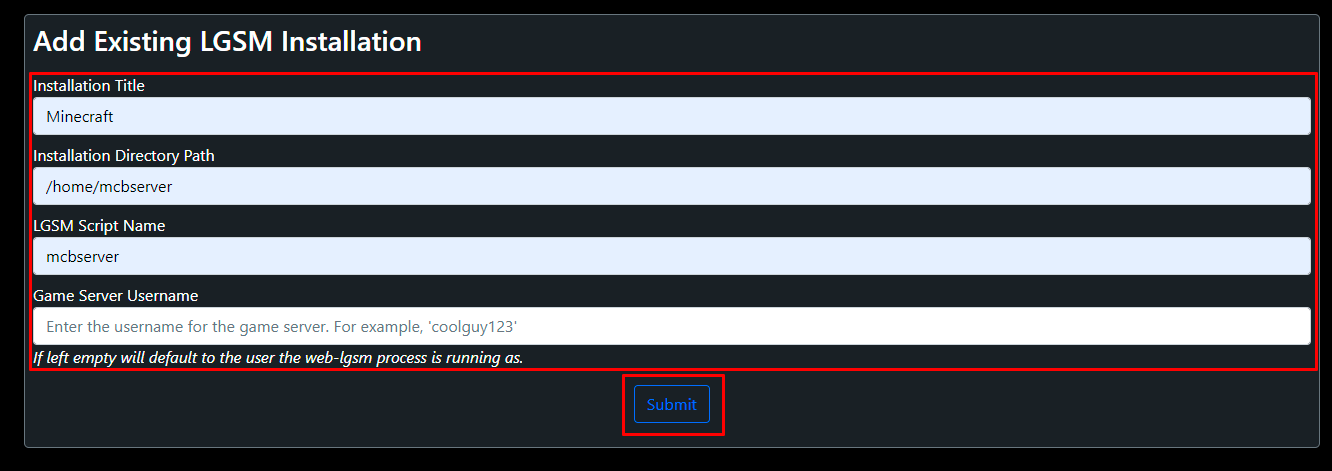 - Game Server Username: Enter the username for the game server (mcbserver). If left blank, it will use the user under which the web-lgsm process is running.