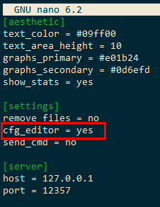 The configuration editor is disabled by default. To activate it, manually edit the main.conf file located at the path /home/mcbserver/web-lgsm/main.conf. In this file, change the value of the cfg_editor parameter from no to yes: