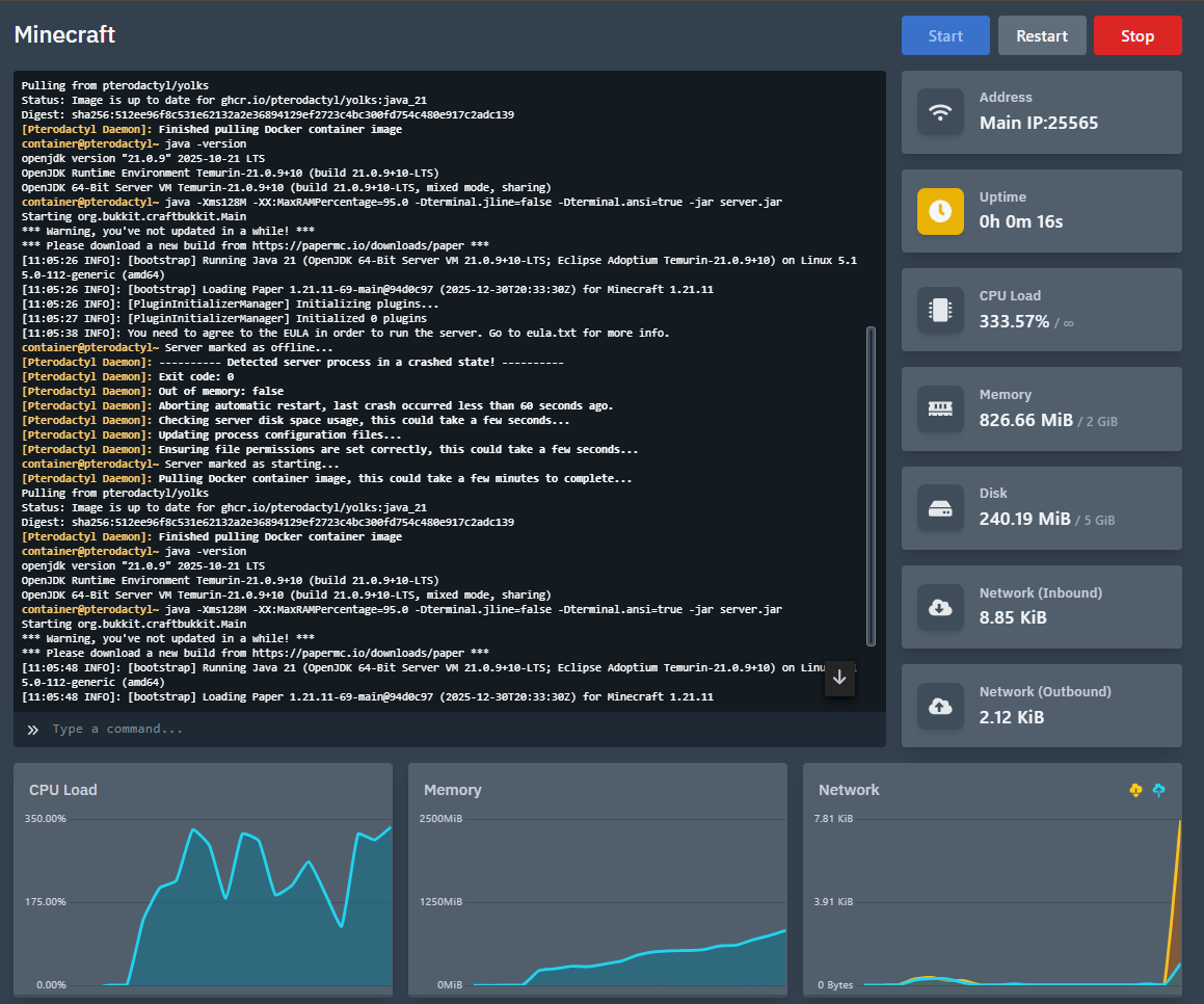 - Real-time statistics monitoring: Displays resource usage graphs (CPU, RAM, disk, network) and game metrics (online players, TPS, ping). Allows creating custom dashboards, configuring alerts, and exporting data to CSV.