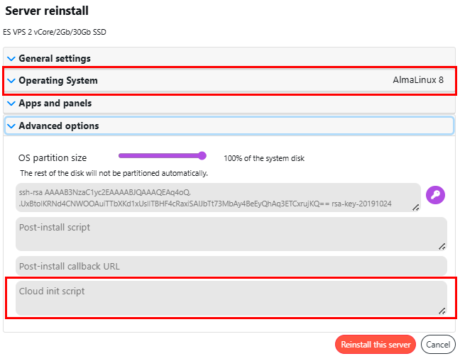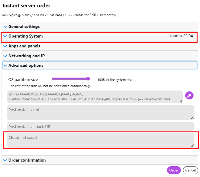 When ordering a new server or reinstalling an operating system, you can use Cloud-init scripts for automatic server configuration. This feature allows you to automate initial system setup immediately after OS installation.