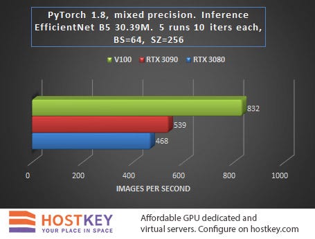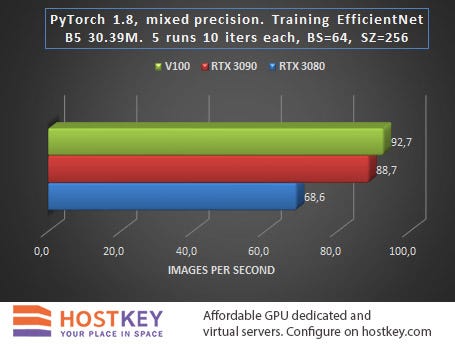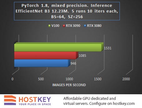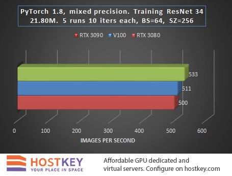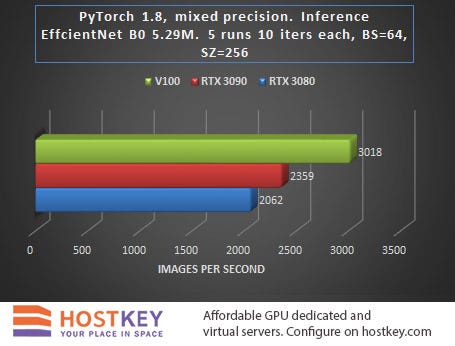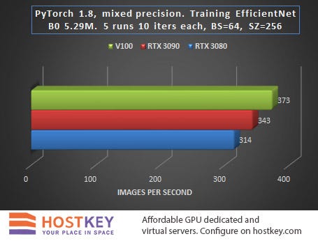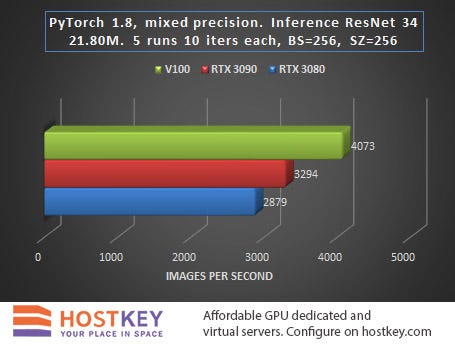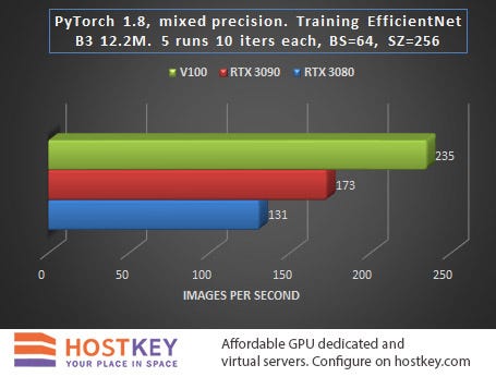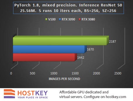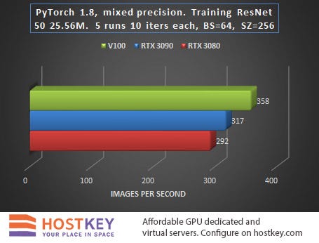 In general, we can say that in training and network inference tasks in Vision tasks, the RTX 3090 card is only 15–20% slower than the Tesla V100 on average, and this is very impressive, especially considering the difference in price.