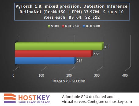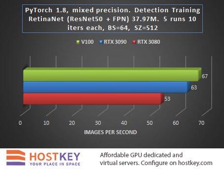 These results prove once again that the RTX 3090 card with its 24 GB of GDDR6X memory is the best choice for tackling heavy imaging tasks — both in performance (65% improvement over the RTX 3080) and in training costs when renting a GPU server.