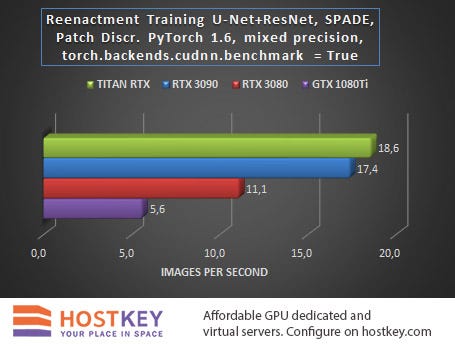 One of the working studies for operational testing of GPU servers based on the new RTX 3090 and RTX 3080 cards was the Face Reenactment process for the U-Net + ResNet neural network with SPADE spatially adaptive normalization and a patch discriminator. Facebook PyTorch version 1.6 with built-in Automated Mixed Precision (AMP) mode and torch.backend.cudnn.benchmark = True flag mode was used as a framework.