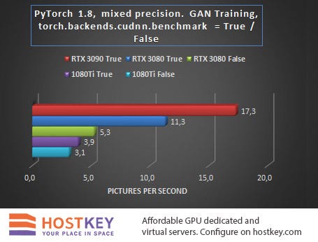 Despite the fact that the RTX 3080 significantly outperformed the GTX 1080 Ti with any flag setting, and this despite the approximate parity in memory size, it should also be remembered that when training the GAN architecture, enabling the torch.backends.cudnn.benchmark flag = True gives a performance boost, but the reproducibility of the results may suffer. So renting a more affordable GPU server with GTX 1080 Ti cards under some conditions may be a reasonable choice, or at least comparable in budget to training models with an RTX 3080.