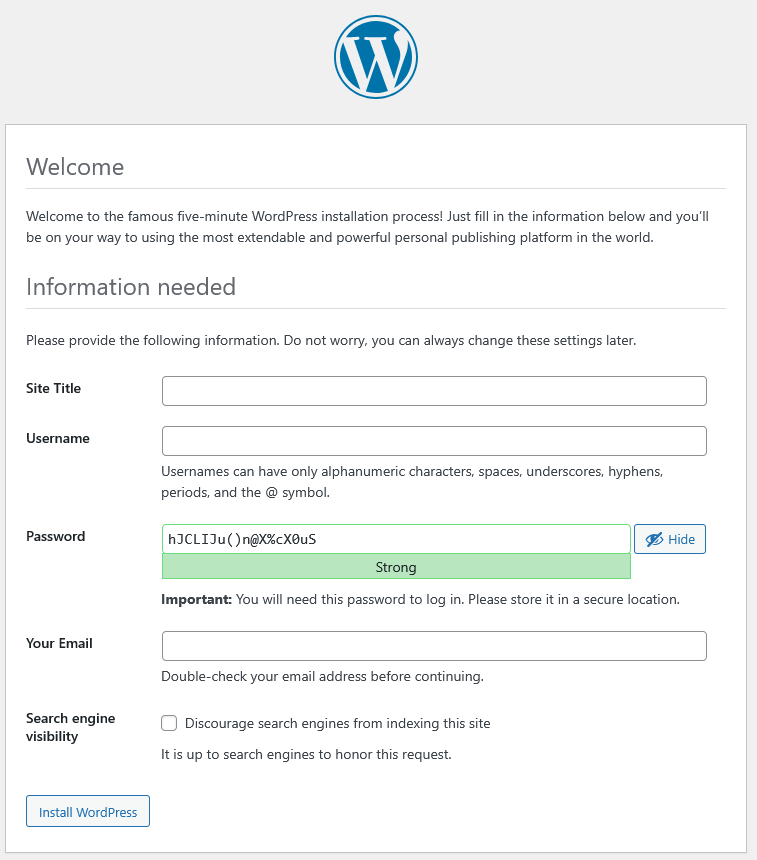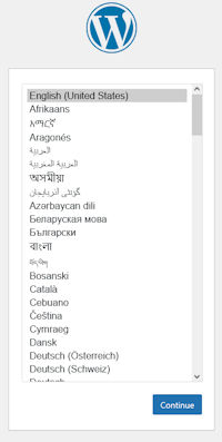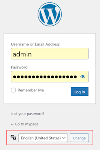 - After installing Wordpress, you need to re-enter the administrator Login and Password. In this window, you can also re-select the application language. Click