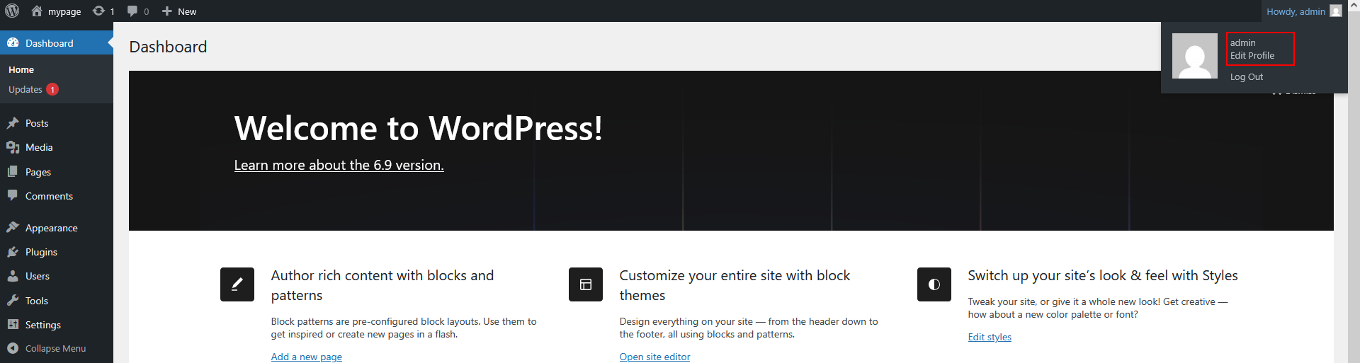 - In the opened window, you can continue working with your page. To change the administrator credentials, click on the profile at the top of the page and select the Edit Profile menu.