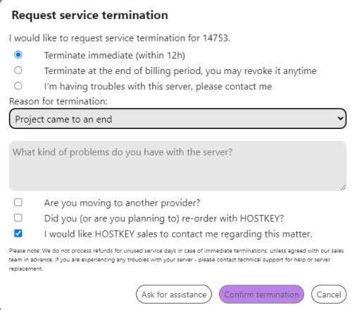 For immediate cancellation, we will not refund the hours of actual server usage, including the time to provision the server itself, order software, and process the cancellation request (up to 12 hours). The unused balance will be returned to the customer's credit balance. Withdrawal of funds from the credit balance will be made in accordance with the our refund policy.