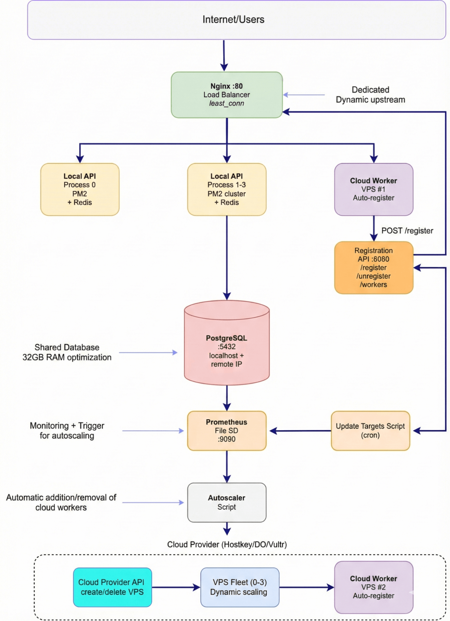 Cloud Workers essentially replicate the functionality of the local API but connect to a remote PostgreSQL database instead of using Redis. This adds a slight latency of 10–20 milliseconds, but it simplifies the overall architecture by providing a single data source for all workers. Upon startup, each worker waits for 2 seconds before automatically registering with Nginx via a fetch request. No manual configuration is required.