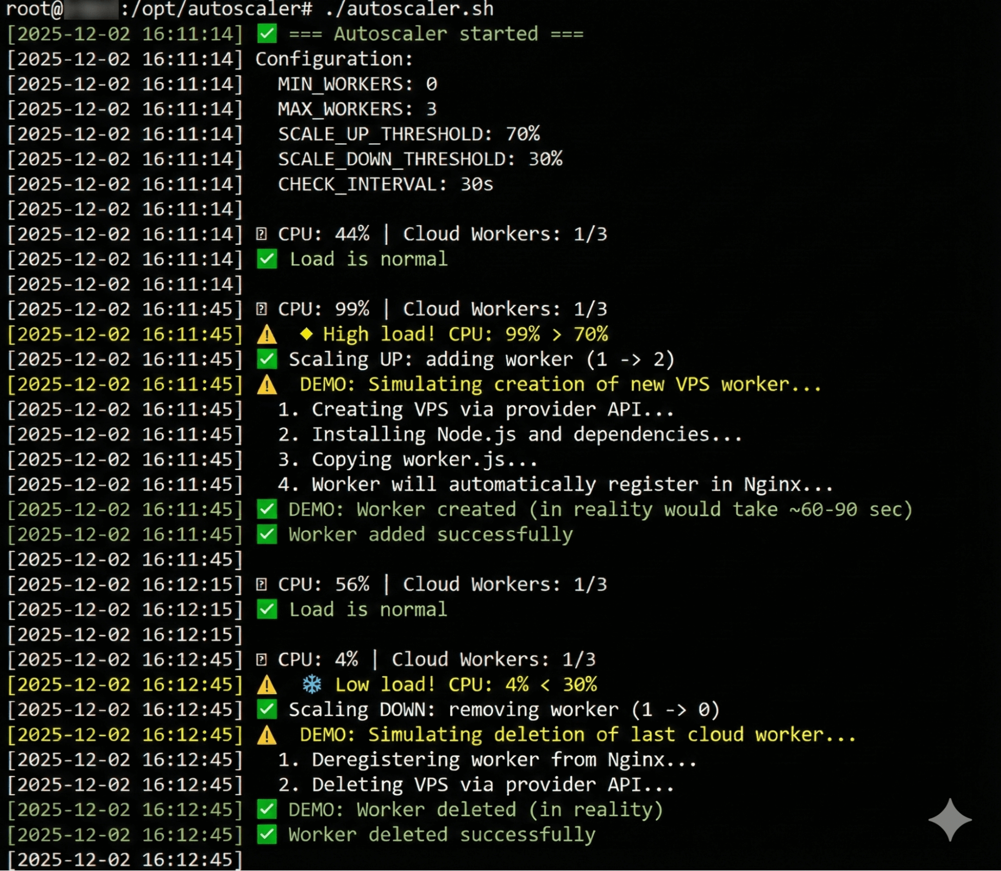 The most challenging part of this process is implementing the autoscaler script, which will likely take 3–4 hours. The script will periodically (every 30 seconds) retrieve the average CPU usage from Prometheus using PromQL to determine whether a new workload should be created (if CPU usage exceeds 70%) or deleted (if it’s below 30%). It will also need to integrate with the cloud provider’s API, wait for the VPS to be created (about 60–90 seconds), and ensure that the new workload registers properly. The script should log all its actions and adhere to the predefined limits for `MIN_WORKERS` and `MAX_WorkERS`. We’ve created a demo version that doesn’t use an actual API; it simply simulates the creation/deletion of workloads. Integrating this with a specific cloud provider will add another 2–3 hours of development time.