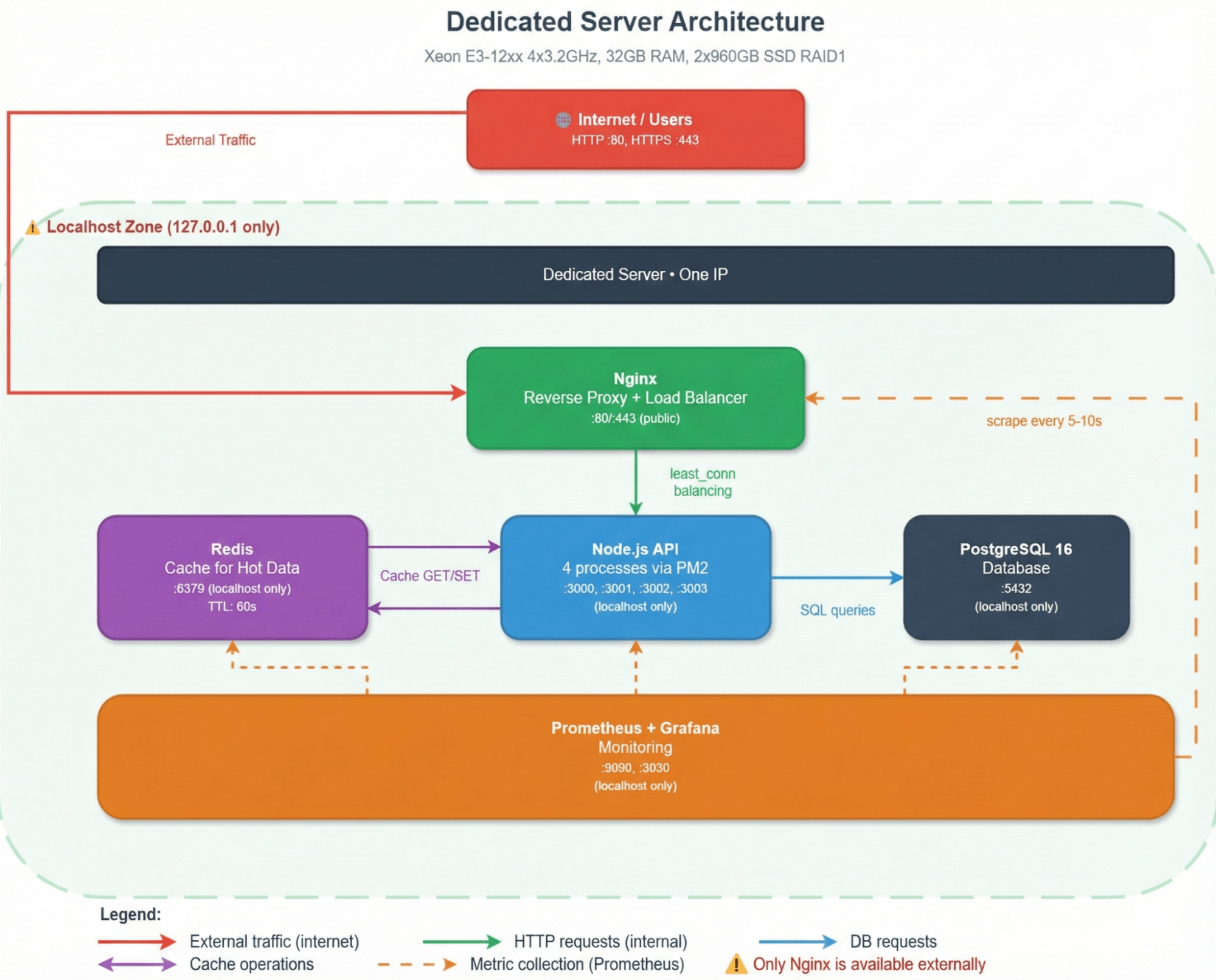 I’d like to remind you that in the cloud version, we had three virtual machines for around 1000₽ per month, which provided similar functionality. However, a dedicated server costing €45 offers excellent performance, more stable latency, built-in Redis caching, full control over the configuration, and predictable costs. The trade-off is additional time spent on setup, administration, and monitoring.