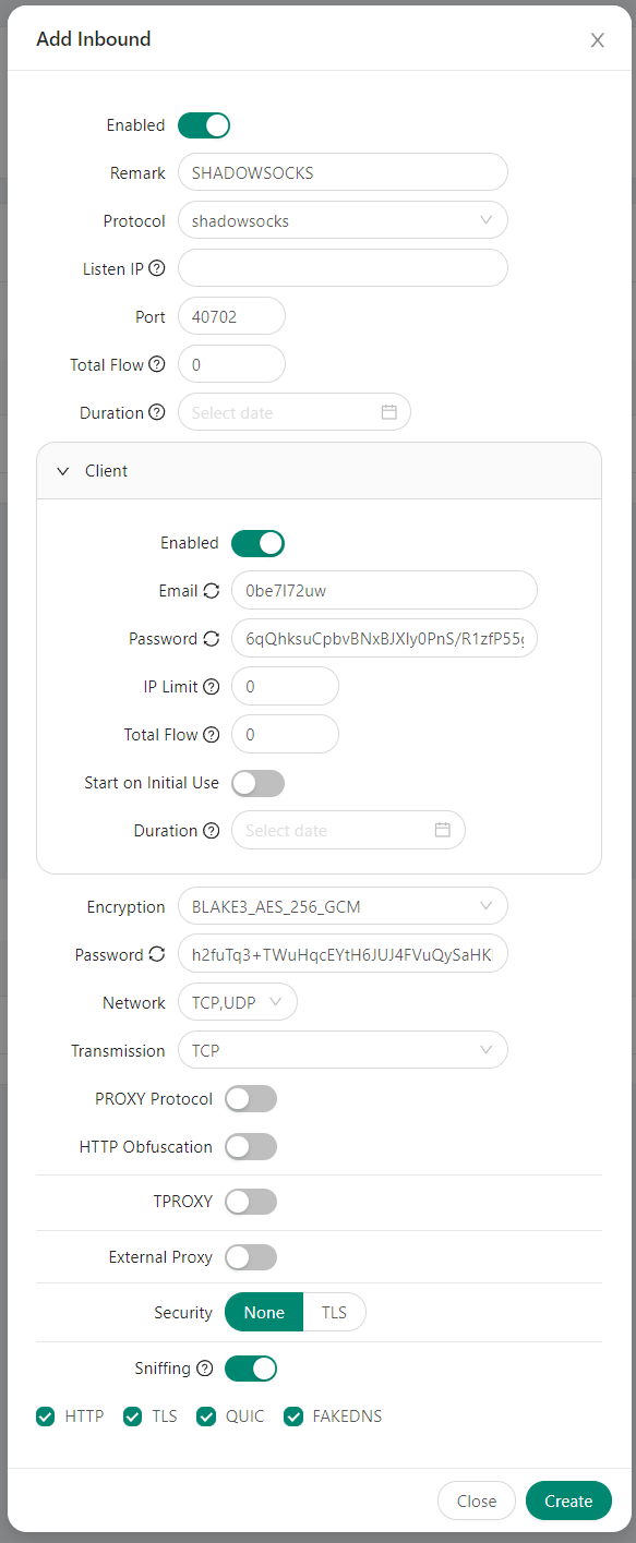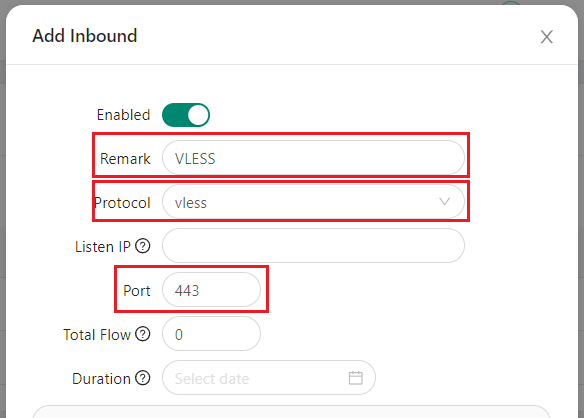 vlessby default, but it can bechanged and configured manually if desired; - Listen IP - if you leave this field empty, the server will listen on all IP addresses;