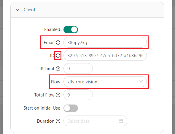 - Email - client ID, must be unique. If entering an email, it must also be unique for each protocol. If you have a user, keep the existing one or create a new user by clicking the