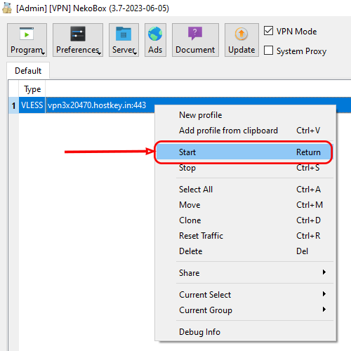 In the Nekoray client, select Program >> Add profile from clipboard.