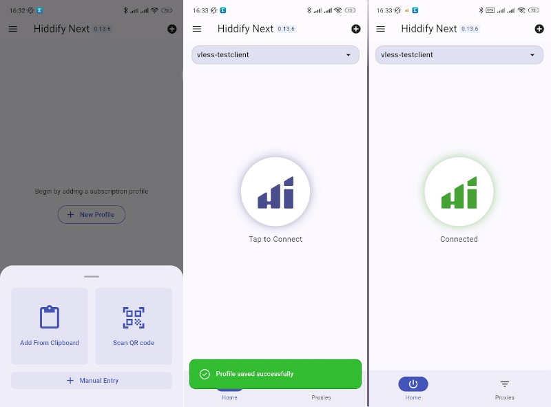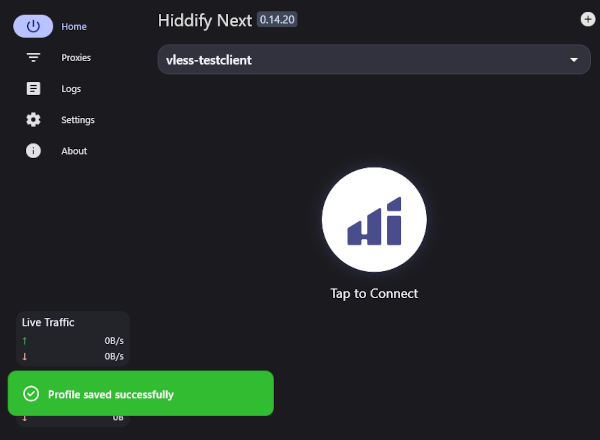 Upon successful completion of the scan, a message will display and the server profile will be added to the list. To connect to the 3X-UI, click the large round button. Once the connection is established, the icon will turn green and display Connected. To disconnect, simply click the button again.