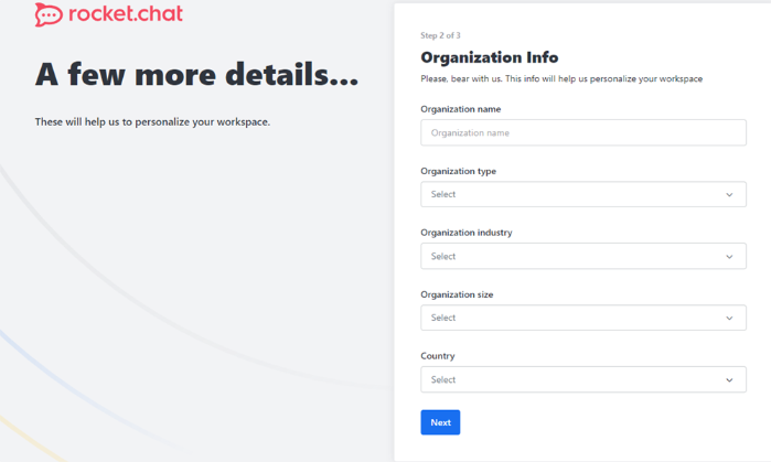 Once the registration procedure is completed, you will be transferred to the Rocket.Chat start menu: