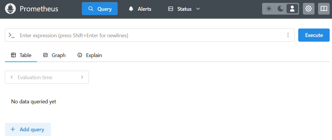 - Query String: A field labeled Enter expression (press Shift+Enter for newlines) for entering PromQL queries. To the right is a button