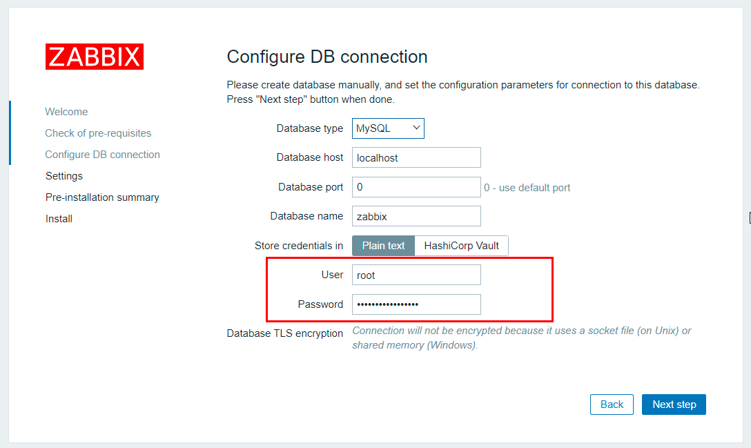 - Username: zabbix for the database, Admin for Zabbix web interface login;