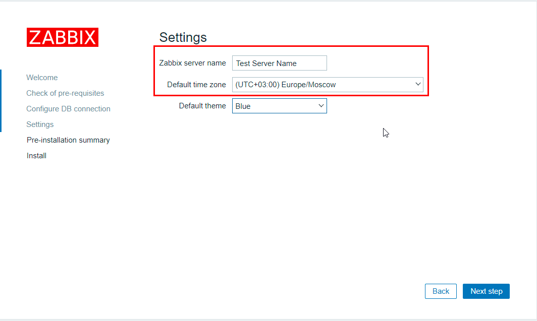 In the next step (Settings), you can specify the server name, time zone, and choose a theme for the design. The most crucial aspect here is correctly setting the time zone: