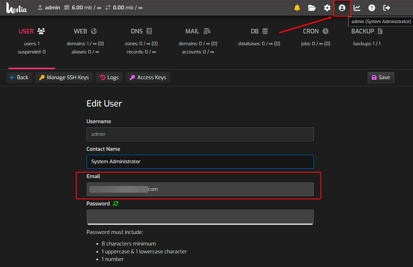 When setting up your profile in the HestiaCP control panel, make sure to provide your real email address in the Email field. This address is crucial for the correct operation of many system features: