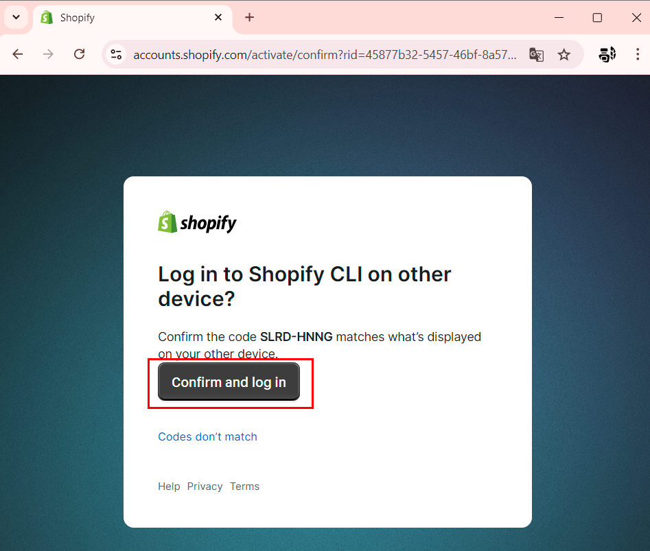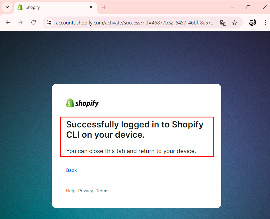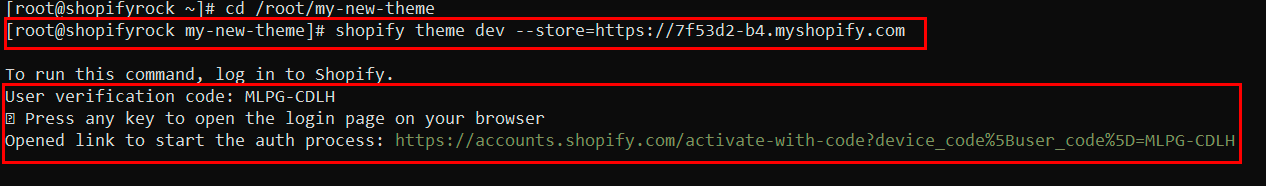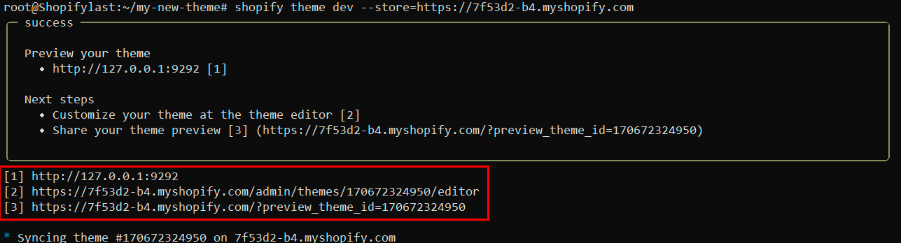 After successful authentication, a "Logged in" message will appear in the terminal, and the command requiring authorization will start executing. You'll also see links for viewing and editing the theme locally and within Shopify's admin panel: