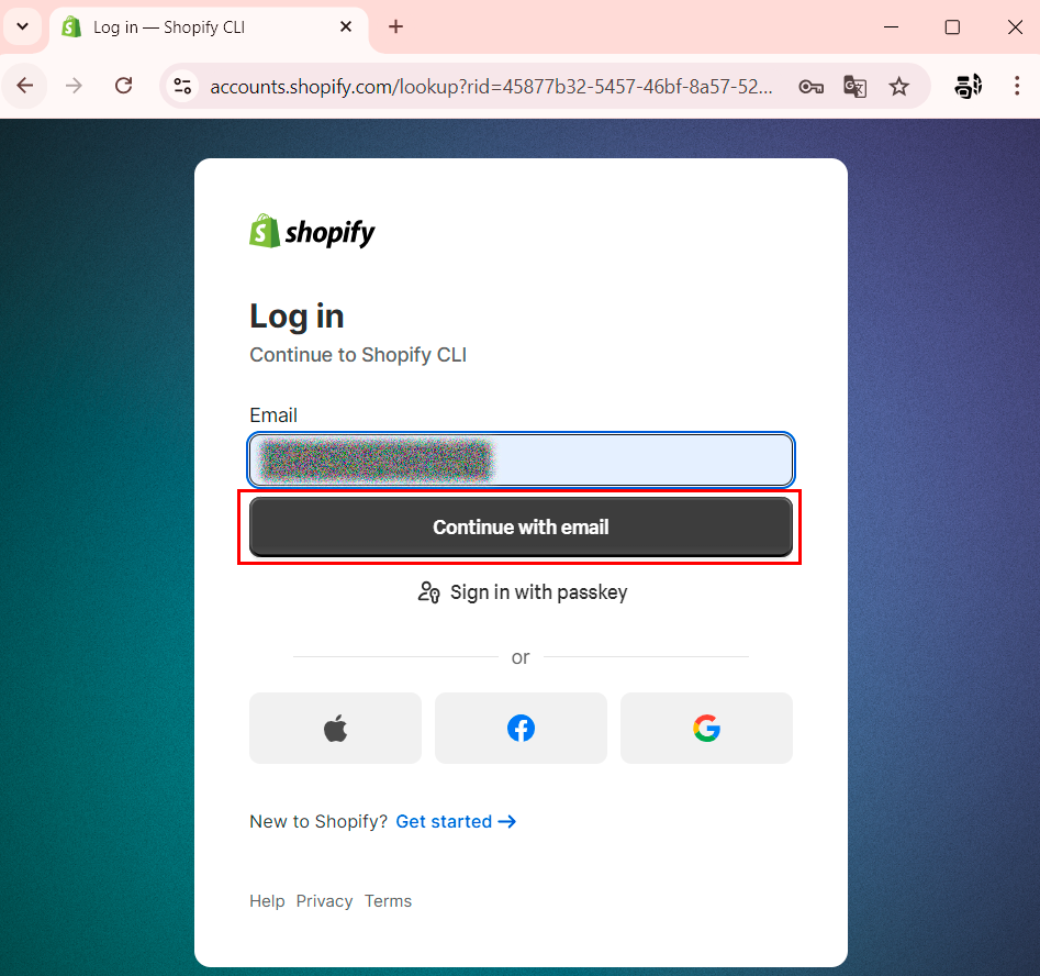 Starting from Shopify CLI version 3.0, there's no explicit command for authentication anymore. If you aren't logged in, the system will automatically prompt you to log in when executing a command requiring authorization. Shopify CLI uses OAuth 2.0 for authentication. This means that after running an authorization-requiring command, you'll be redirected to the Shopify login page in your browser. You'll then need to log into your account and confirm access to the desired store. OAuth 2.0 is a standard for secure authorization, allowing access to your store without needing to manually store passwords or tokens.